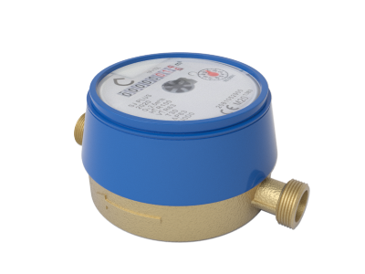 Medidor de agua potable fría de lectura directa, de chorro simple, caudal nominal 1,5 m³/h, diámetro 1/2", temperatura máxima 30°C, presión máxima 16 bar, apto para aguas muy duras, con tapa, racores de conexión y precinto.