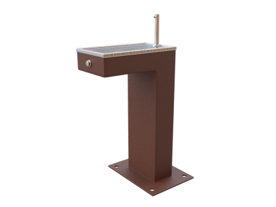 Fuente de 85 cm de altura, con cuerpo de lámina de acero cincado con protección antioxidante y pintura de color marrón, caño y pulsador de latón acabado cromado mate y rejilla y bandeja interior de acero inoxidable AISI 316L, colocación con marco de acero galvanizado y pernos de anclaje. | ||